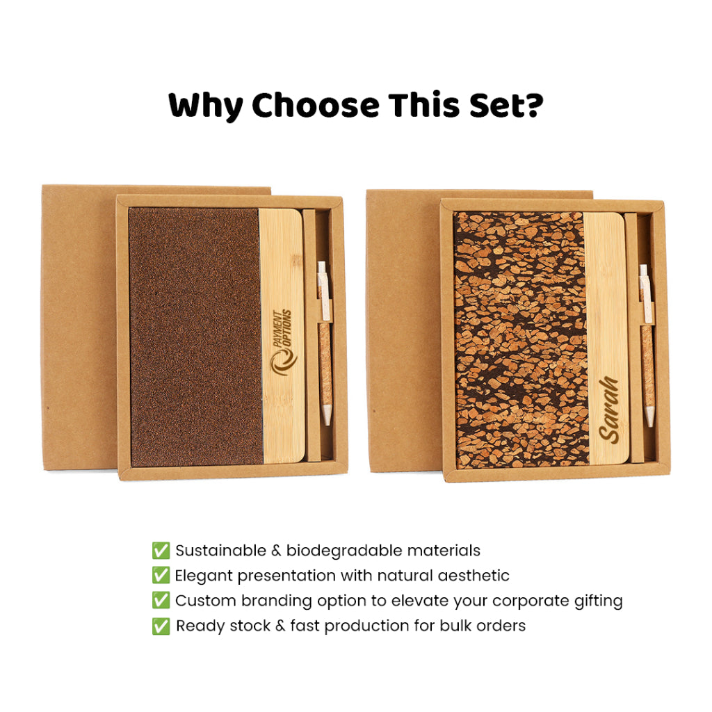 Crafted entirely from eco-friendly materials, this gift set blends sustainability, style, and function — ideal for companies and individuals looking to make a thoughtful impression while reducing environmental impact.
